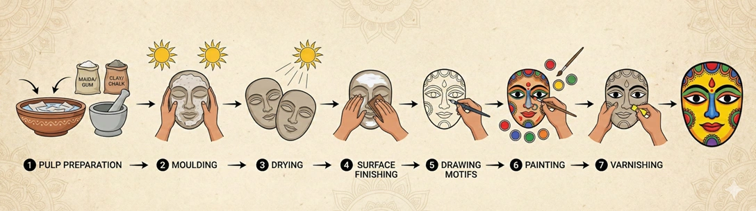 A Madhubani papier-mache mask takes 3–8 days to make and involves 1–2 artisans in the process